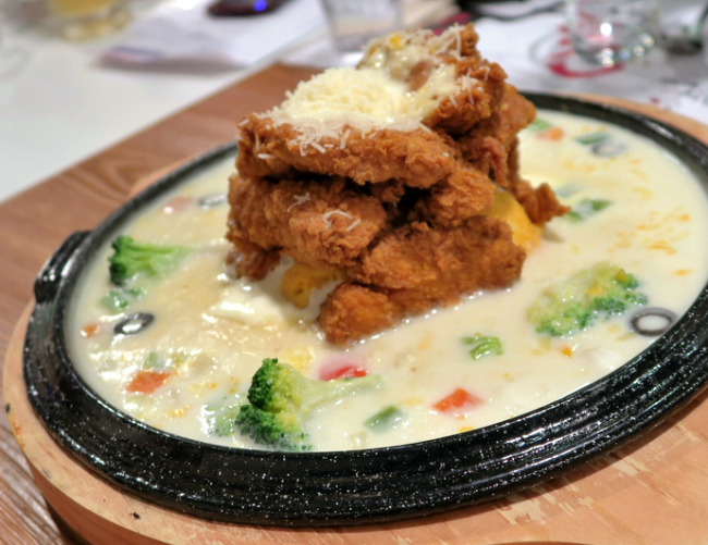 Charred Lamb Rump (S$32). The Australian lamb rump, sous vide then pan seared and sliced, is soft and tender. It is served on a bed of mash potatoes, diced bacon, green peas, chopped onions and lettuce, plus herbs and jus of rosemary and thyme. Those who prefer some hint of gaminess would be disappointed, as the meat is not gamey at all.