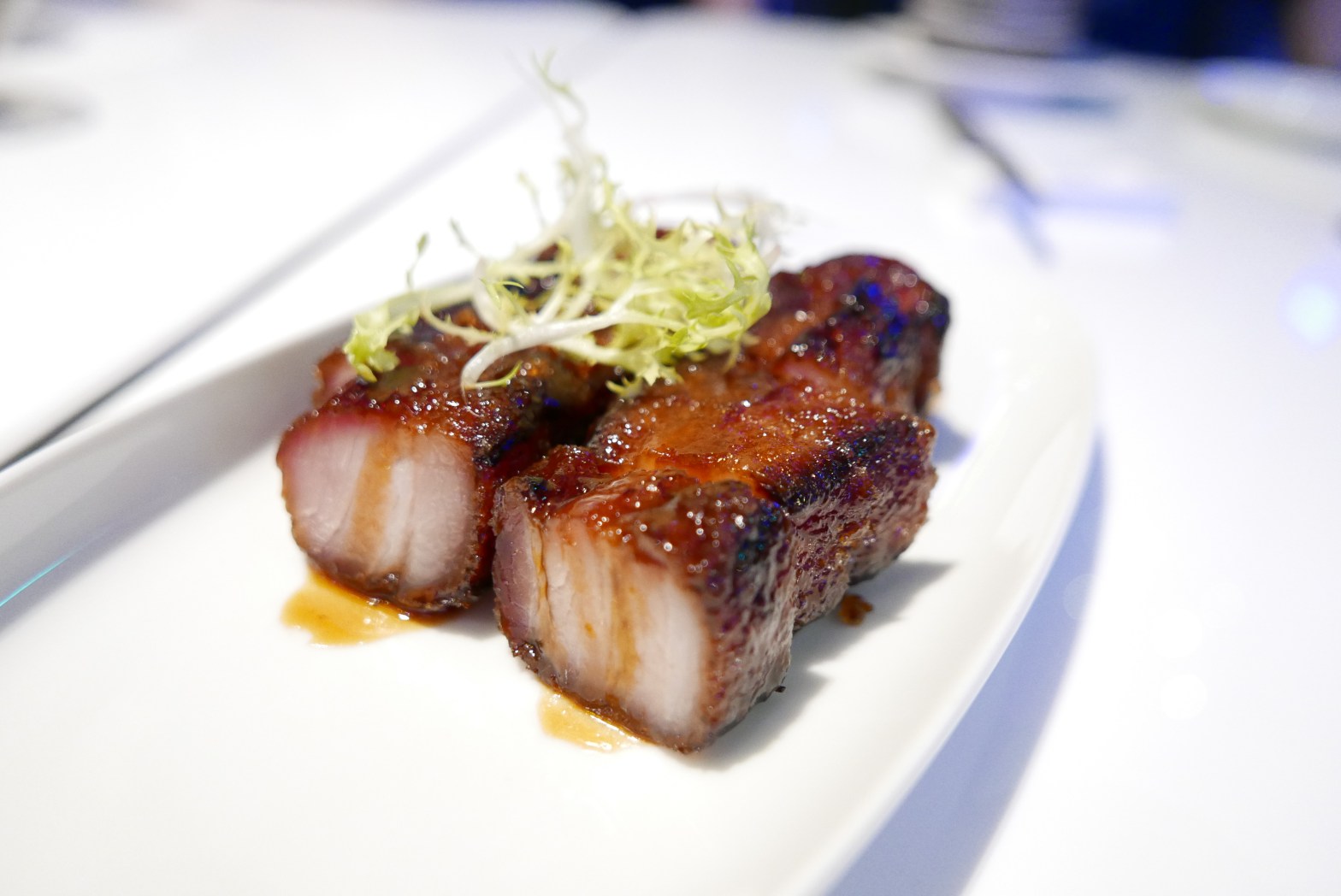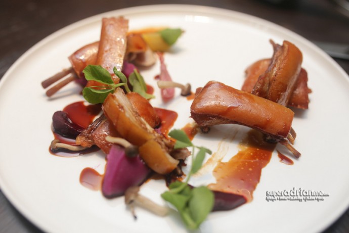 Roasted Mangalica Pork Belly (S$34). Mangalica is a Hungarian pork breed, known for growing a thick wool coat like sheep and popular for its high quality fat. Cooked in a charcoal oven and sliced, the pork belly has a crispy skin and a melt-in-the-mouth sensation. Julienne of green apple, red onion and ginger, together with the apple cider dressing helps to balance its richness, while sautéed bok choy with soy sauce gives it an oriental touch.