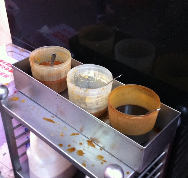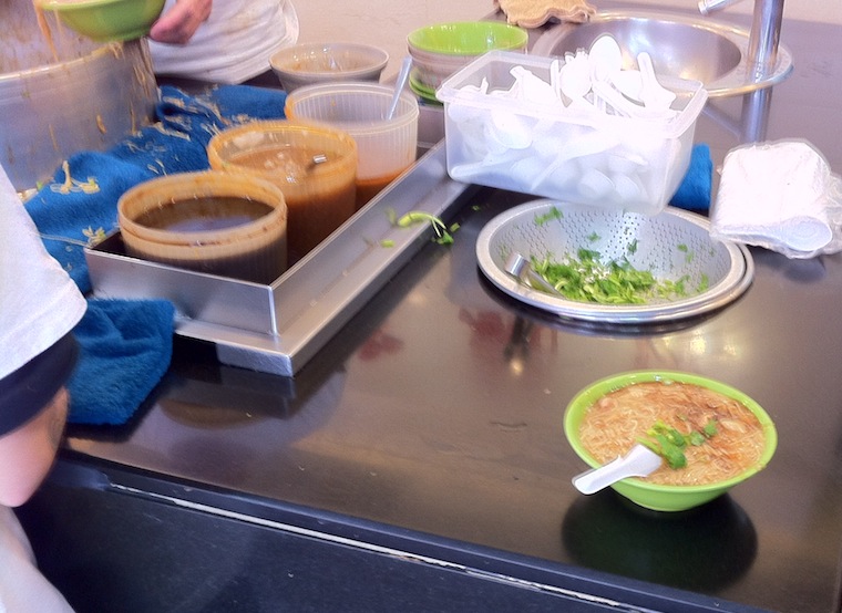 There are only a few small portable tables and seats in front of the shop. Most customers buy and stand around to eat, slurping and perspiring and totally enjoying that little potent bowl of noodles, that comes with little bits of chewy intestines, and a broth that has the perfect balance of  stickiness and smoothness.  NT 6o for a large bowl and NT45 for a small.